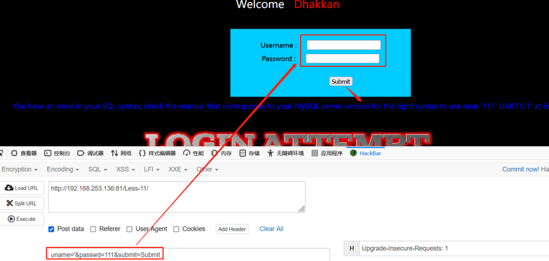 进入SQLi-labs的Less-11关,输入Username、Password。