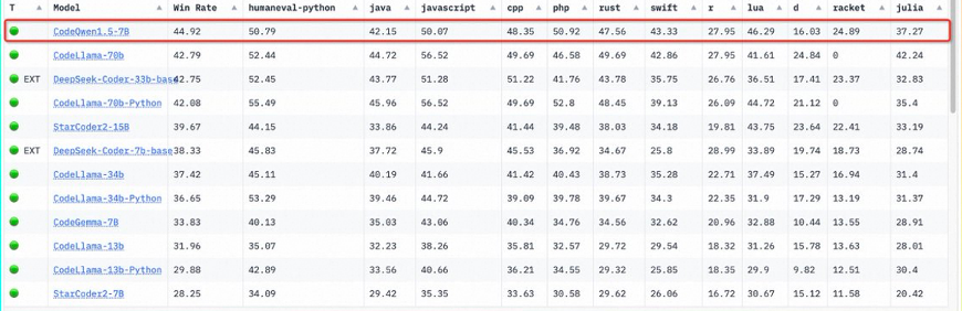 代码方面,专门用于编程的CodeQwen1.5也拿到了 Bigcode 模型排行榜第一的位置。