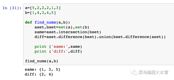 给定两个列表,需要你快速的寻找相同的元素,可以用很多方法,自己写算法也可以直接用set里面的内置函数intersection()和difference()