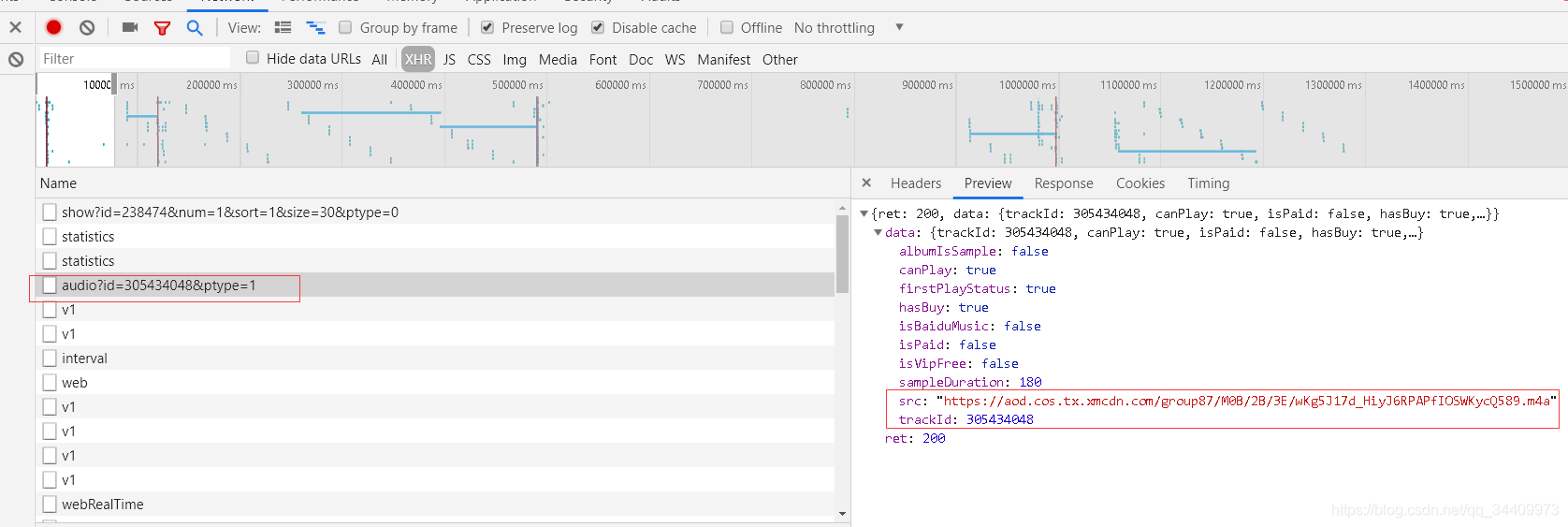 顺着左侧的url查看,发现下面这个url对应的右侧数据,有我们需要的.m4a音频文件数据。