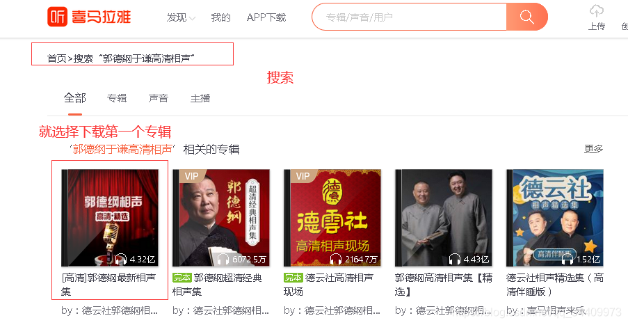 搜索郭德纲相声,选择第一个专辑,点击进入。