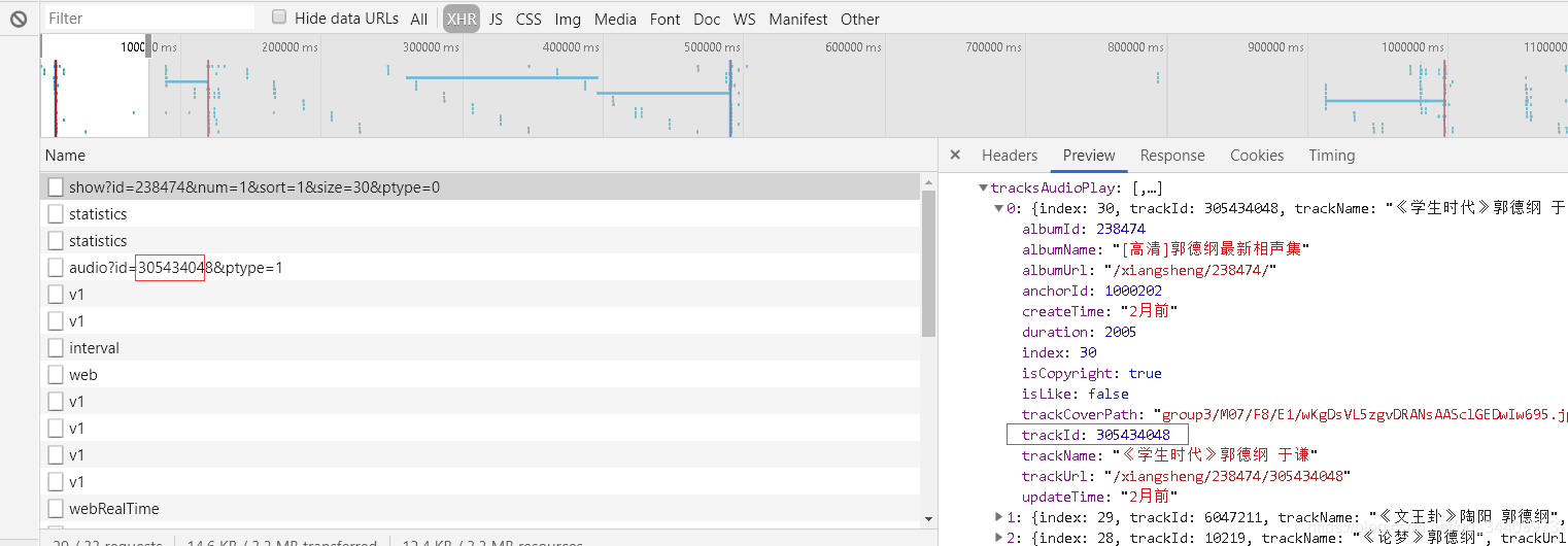 接着点开右侧 Preview预览的文件,trackId就是区分每个文件的id。要找到下载数据的地方,就必须找到唯一的关键词。
