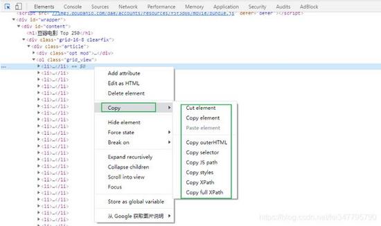 通过这种方法,我们能快速定位出页面某个 DOM 节点,然后可以提取出相关的解析语句。鼠标移动到节点,然后右击鼠标,选择 “Copy”,能快速复制出 Xpath 、CSS elector 等内容解析库的解析语句。