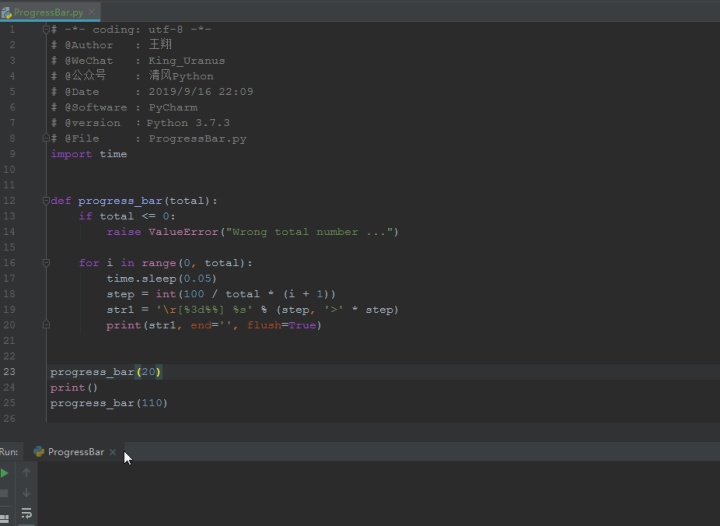 python打印进度条的原理其实很简单,先让我们看一个例子吧: