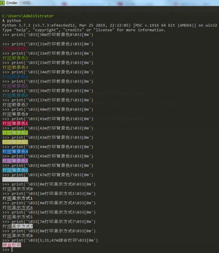 最后一个\033[5;31;47m**综合打印为使用闪烁方式红色字体白色背景色打印文字!