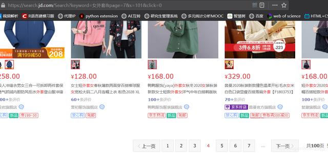 之前复制的第二个和第三个URL“page=”后面分别是3、5,由于搜索商品的页面默认是第一页,复制下来的URL也跟第二页、第三页差别比较大,于是我试着将“page=”后面的数字改为1,发先页面跳到了第一页;于是我们的URL就可以确定了: