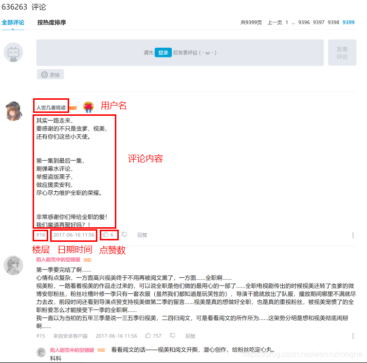 - 首先观察评论区结构,发现评论区为鼠标点击翻页形式,共 9399 页,每一页有 20 条评论,每条评论中包含 用户名、评论内容、评论楼层、时间日期、点赞数等信息展示。