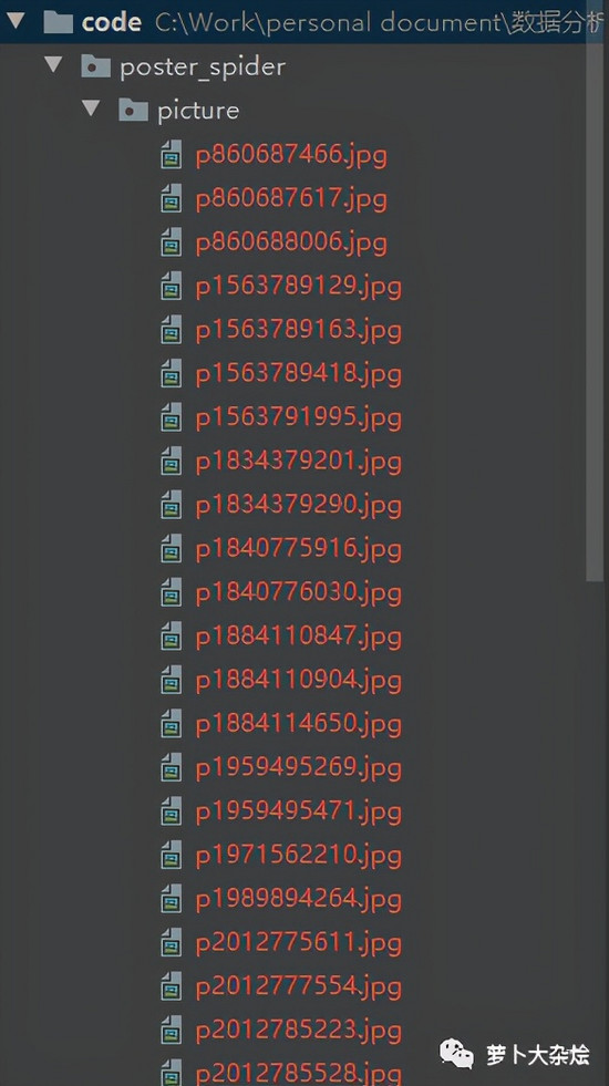 下面就执行 fire 函数,等待程序运行完成后,当前目录下会生成一个 picture 的文件夹,里面保存了我们下载的所有海报