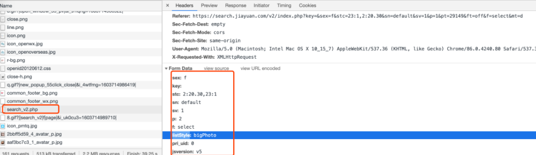 点开 Hearders 拉到最下面,在它的参数中 sex 是性别、stc 是年龄、p 是分页、listStyle 是有照片