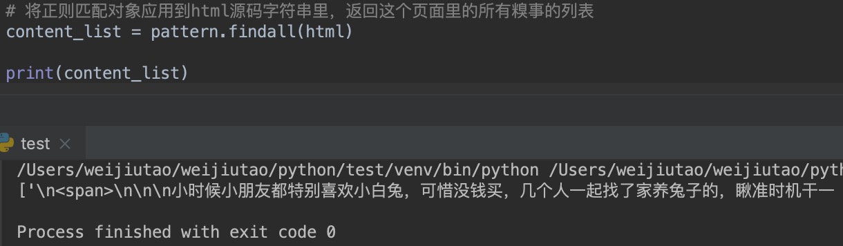 20 # 将正则匹配对象应用到html源码字符串里,返回这个页面里的所有糗事的列表