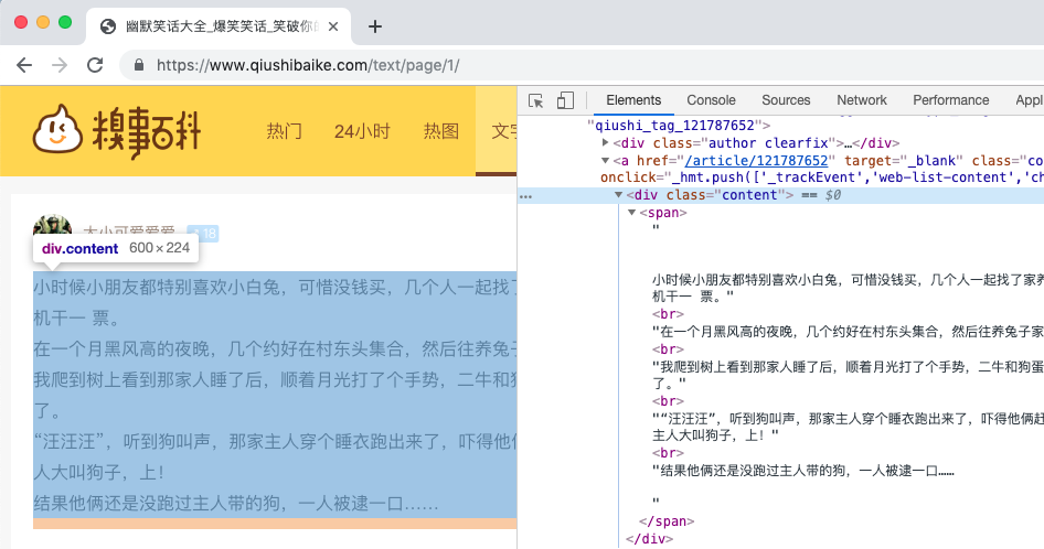 我们通过调用开发者工具检查 HTML 元素发现我们想要的内容在 <div class="content"> ...... </div> 内,根据这个我们可以写出代码如下: