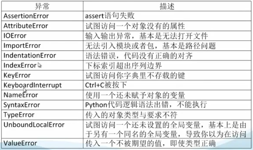 注意:虽然大多数错误会导致异常,但一个异常不一定代表错误,有时候它们只是一个警告,有时候它们可能是一个终止信号,比如退出循环等。