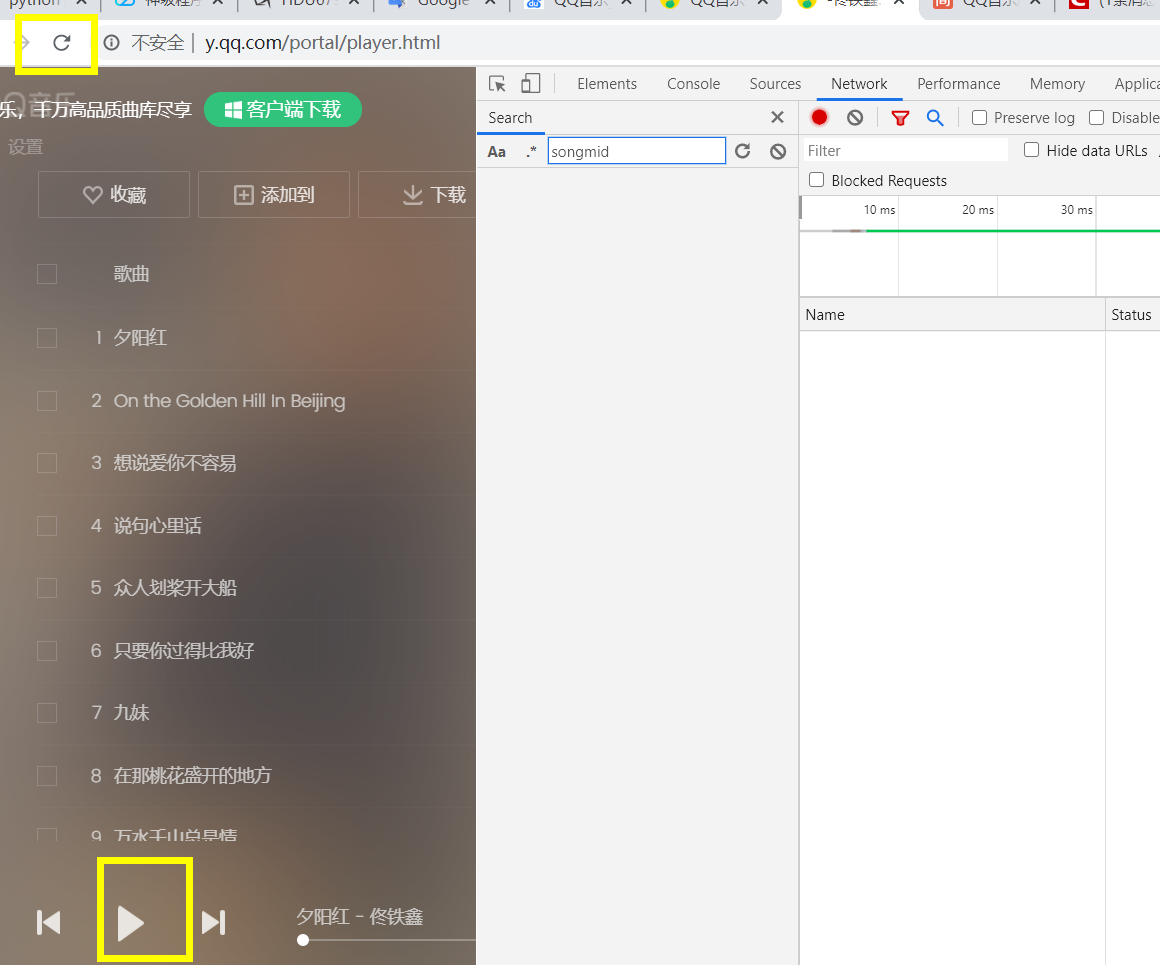 2、点击播放歌曲会打开一个页面,按F12打开控制台,然后刷新页面并点击播放歌曲,network里面就会有数据包