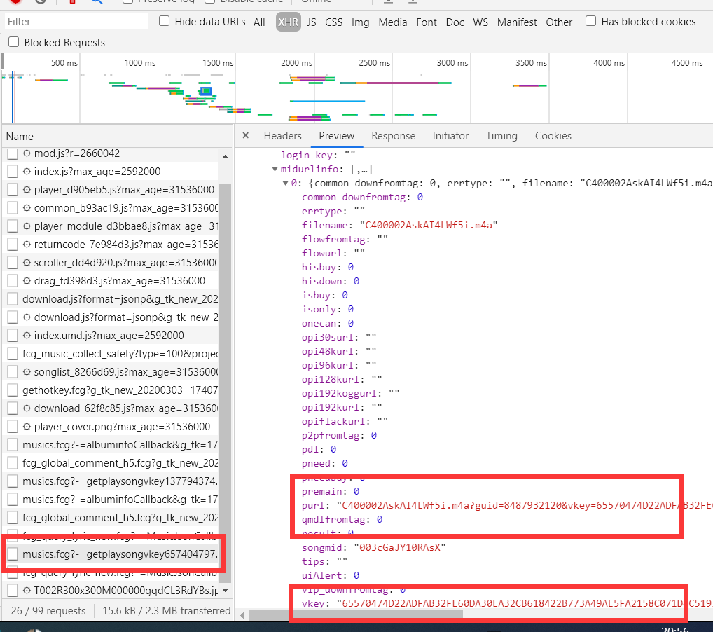 我找到了vkey且对比了一下和之前链接上vkey的值一样,你再仔细看就会发现那个歌曲下载链接就是