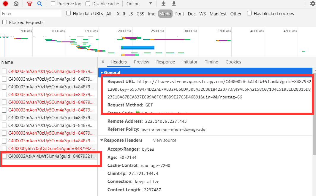 3、在控制台选中media,找到下图这样类型的文件,它的request url就是歌曲播放url,如下下图