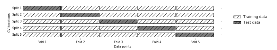 Cross Validation:进行多次train_test_split划分;每次划分时,在不同的数据集上进行训练,测试评估,从而得到一个评价结果;如果是5折交叉验证,意思就是在原始数据集上,进行五次划分,每次划分进行一次训练,评估,最后得到5次划分后的评估结果,一般在这几次评估结果上取平均得到最后的评分,k-folf cross-validation ,其中K一般取5或10。