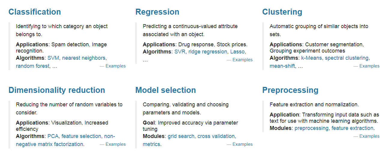 由图中,可以看到库的算法主要有四类:分类,回归,聚类,降维。其中: