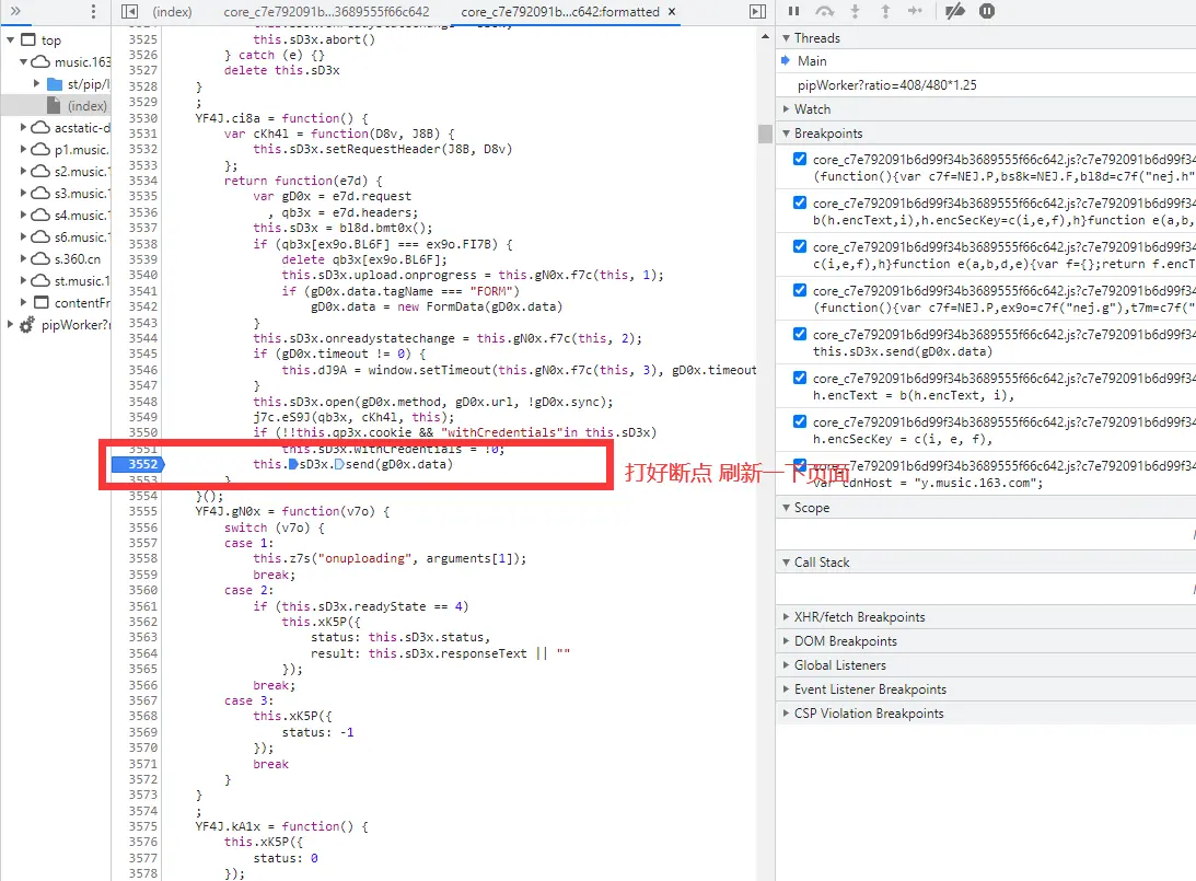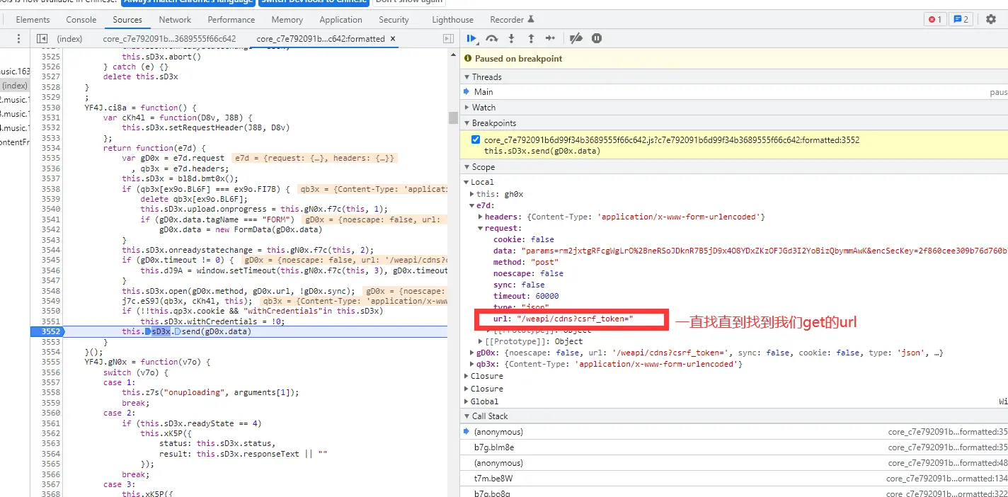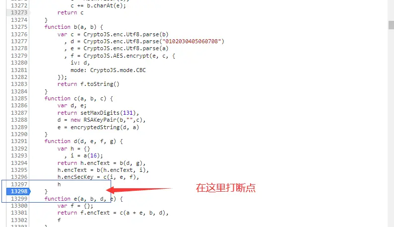 找到了加密的页面后,我们需要一行一行的打断点,知道找到data里的内容被加密的那一行