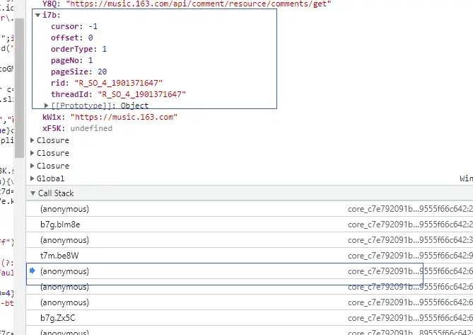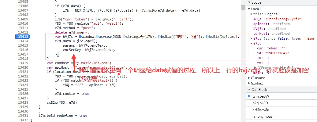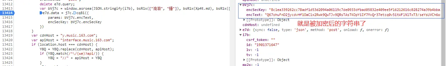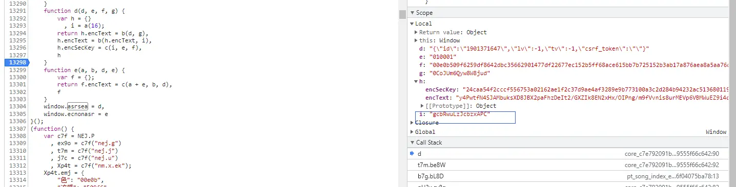 于是我们必须另辟蹊径,我们发现无论是b还是c函数,传入的参数除了i都是定值,也就是说如果我们能把i定下来,那么h.encSecKey就可定下来了,那么我们如何把i定下来呢?