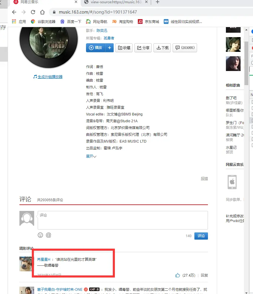 首先任意选择一条评论,查看是否是写在源代码里面的