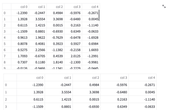 dateframe 和 table 的区别是,前者可以在表格上做交互(如:排序),后者只是静态的展示。它们支持展示的数据类型包括 pandas.DataFrame、pandas.Styler、pyarrow.Table、numpy.ndarray、Iterable、dict。
