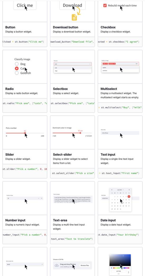 Streamlit 提供的输入组件都是基本的,都是我们在网站、移动APP上经常看到的。包括: