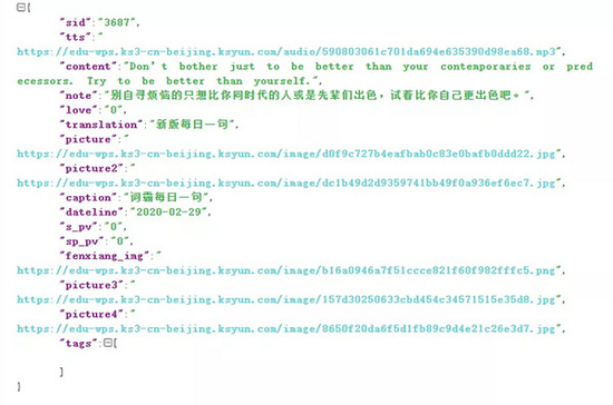 对于金山词霸的每日一句,我们可以使用如下的一个 API 来获得每天的信息