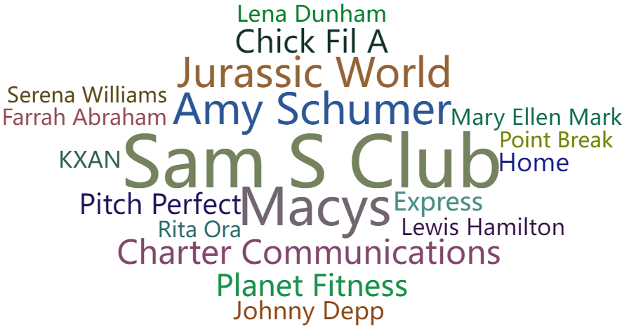 'Sam S Club', 'Macys', 'Amy Schumer', 'Jurassic World', 'Charter Communications',