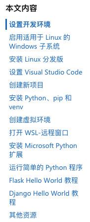 具体内容包括:设置开发环境、启用 WSL、安装 Linux 分发版、设置 Visual Studio Code、创建新项目、安装 Python、pip 和 venv、创建虚拟环境等步骤,以及 Flask Hello World 教程和 Django Hello World 教程。