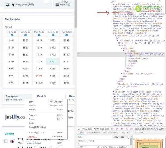 接下来,我们用Python来选择出最低票价的页面元素。上述代码中红色部分就是XPath选择器的代码,在网页中,你可以在任意位置点击右键并选择“检查”来找到它。试试吧,在你想看代码的地方点右键,“检查”它。