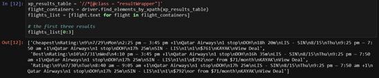 基于上述代码结果,如果我想找出所有匹配的结果并存到list里,该怎么做呢?很简单,因为所有结果都在CSS对象resultWrapper中,只要按照我下图代码中写个for循环就能获得所有结果。这个思路掌握了,那下图的代码你也就基本看明白了。也就是说,先选定最外层的页面元素(如本文网站中的resultWrapper),再找一种方式(如XPath)来获取信息,最后再将信息存到可读的对象中(本例中先存在flight_containers中,再存在flights_list中)。