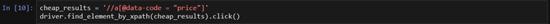 1 # This is what the copy method would return. Right click highlighted rows on the right side and select "copy > Copy XPath"//*[@id="wtKI-price_aTab"]/div[1]/div/div/div[1]/div/span/span 2 # This is what I used to define the "Cheapest" buttoncheap_results = ‘//a[@data-code = “price”]’