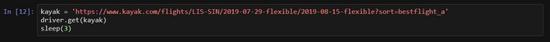 点击搜索按钮并获取地址栏中的链接。这个链接应该就是我在下面需要用的链接,在这里我将变量kayak定义为url并调用webdriver的get方法。你的搜索结果接下来应该就会出现了。