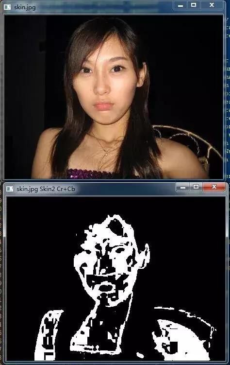# 肤色检测之二: YCrCb中 140<=Cr<=175 100<=Cb<=120img = cv2.imread(imname, cv2.IMREAD_COLOR)ycrcb = cv2.cvtColor(img, cv2.COLOR_BGR2YCrCb) # 把图像转换到YUV色域(y, cr, cb) = cv2.split(ycrcb) # 图像分割, 分别获取y, cr, br通道分量图像 skin2 = np.zeros(cr.shape, dtype=np.uint8) # 根据源图像的大小创建一个全0的矩阵,用于保存图像数据(x, y) = cr.shape # 获取源图像数据的长和宽 # 遍历图像, 判断Cr和Br通道的数值, 如果在指定范围中, 则置把新图像的点设为255,否则设为0for i in range(0, x): for j in range(0, y): if (cr[i][j] > 140) and (cr[i][j] < 175) and (cb[i][j] > 100) and (cb[i][j] < 120): skin2[i][j] = 255 else: skin2[i][j] = 0 cv2.imshow(imname, img)cv2.imshow(imname + " Skin2 Cr+Cb", skin2)