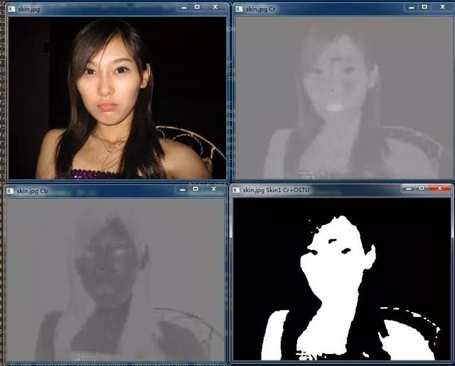 # 肤色检测之一: YCrCb之Cr分量 + OTSU二值化img = cv2.imread(imname, cv2.IMREAD_COLOR)ycrcb = cv2.cvtColor(img, cv2.COLOR_BGR2YCrCb) # 把图像转换到YUV色域(y, cr, cb) = cv2.split(ycrcb) # 图像分割, 分别获取y, cr, br通道图像# 高斯滤波, cr 是待滤波的源图像数据, (5,5)是值窗口大小, 0 是指根据窗口大小来计算高斯函数标准差cr1 = cv2.GaussianBlur(cr, (5, 5), 0) # 对cr通道分量进行高斯滤波# 根据OTSU算法求图像阈值, 对图像进行二值化_, skin1 = cv2.threshold(cr1, 0, 255, cv2.THRESH_BINARY + cv2.THRESH_OTSU) cv2.imshow("image CR", cr1)cv2.imshow("Skin Cr+OSTU", skin1 )