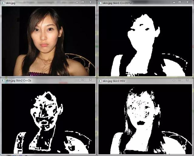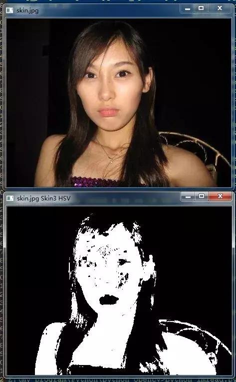 # 肤色检测之三: HSV中 7<H<20 28<S<256 50<V<256img = cv2.imread(imname, cv2.IMREAD_COLOR) hsv = cv2.cvtColor(img, cv2.COLOR_BGR2HSV) # 把图像转换到HSV色域(_h, _s, _v) = cv2.split(hsv) # 图像分割, 分别获取h, s, v 通道分量图像skin3 = np.zeros(_h.shape, dtype=np.uint8) # 根据源图像的大小创建一个全0的矩阵,用于保存图像数据(x, y) = _h.shape # 获取源图像数据的长和宽 # 遍历图像, 判断HSV通道的数值, 如果在指定范围中, 则置把新图像的点设为255,否则设为0for i in range(0, x): for j in range(0, y): if (_h[i][j] > 7) and (_h[i][j] < 20) and (_s[i][j] > 28) and (_s[i][j] < 255) and (_v[i][j] > 50) and (_v[i][j] < 255): skin3[i][j] = 255 else: skin3[i][j] = 0 cv2.imshow(imname, img)cv2.imshow(imname + " Skin3 HSV", skin3)