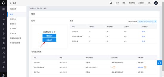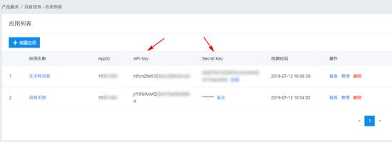 选择创建对应的「文字转语音」和「语音识别」应用,就会给你一串秘钥,重点保存好:API key 和 Secret key.