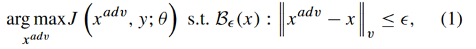 生成的对抗样本与原始样本之间的差异,在用v-范数衡量时,必须小于等于ε。Bε(x)指的是以原始样本为中心,半径为 ε 的球域