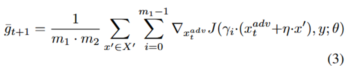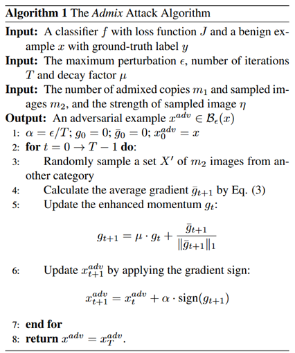 由此提出一种Admix的攻击方法,通过改变γ的值或从不同类中提取图像x′,来计算混合图像的平均梯度。