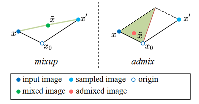 3)如图所示,mixup对x和x′进行线性插值,admix则没有这样的约束,变换后的图像更加多样化。