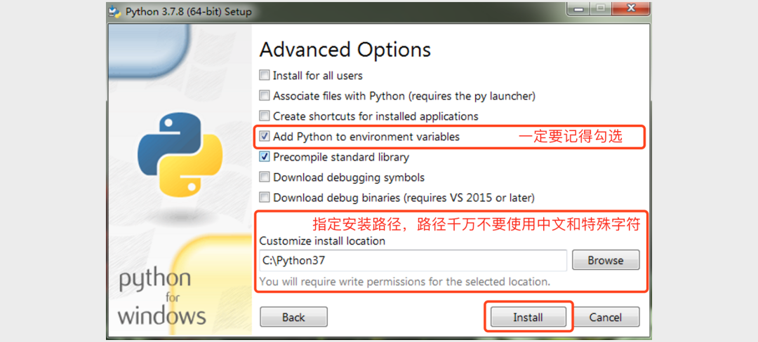 双击运行刚才下载的安装程序,会打开Python环境的安装向导。在执行安装向导的时候,记得勾选“Add Python 3.x to PATH”选项,这个选项会帮助我们将Python的解释器添加到PATH环境变量中(不理解没关系,照做就行),具体的步骤如下图所示。