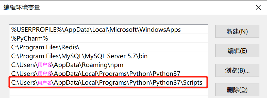 这里新添加的路径 C:\Users\你的用户名\AppData\Local\Programs\Python\Python37\Scripts 是Python安装好