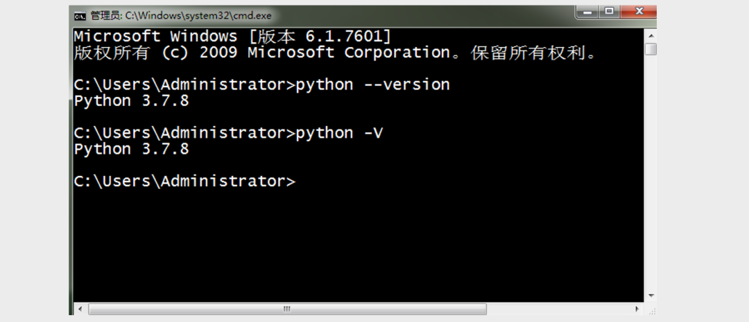 安装完成后可以打开Windows的“命令行提示符”工具并输入python --version或python -V来检查安装是否成功,命令行提示符可以在“运行”中输入cmd来打开或者在“开始菜单”的附件中找到它。如果看了Python解释器对应的版本号(如:Python 3.7.8),说明你的安装已经成功了,如下图所示。