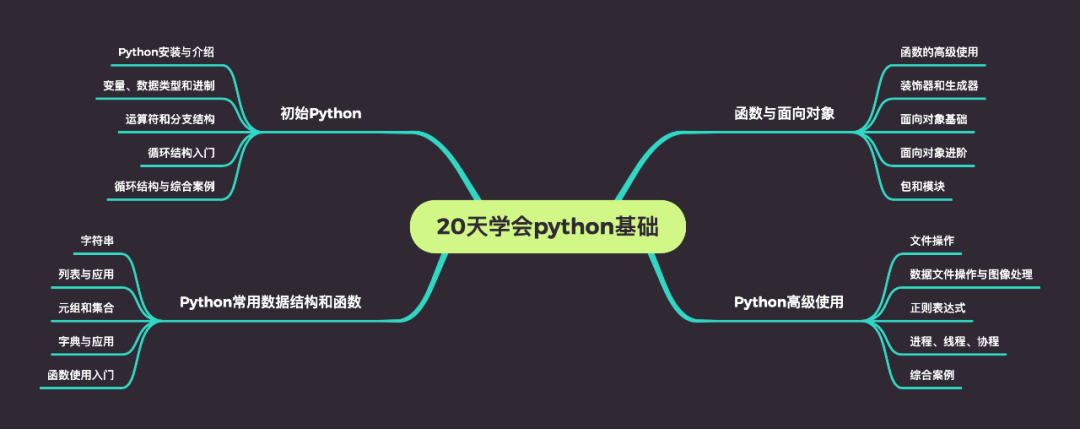 于是有了一个大胆的想法,更细致的写一系列的Python相关的文章,首先是20天学会Python基础,里面涵盖了Python必备的基础知识点,希望大家能利用业余时间掌握