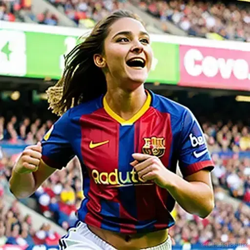 “一位身穿巴塞罗那足球俱乐部球衣的年轻女子,与背景中的足球队员及人群一同庆祝进球。”