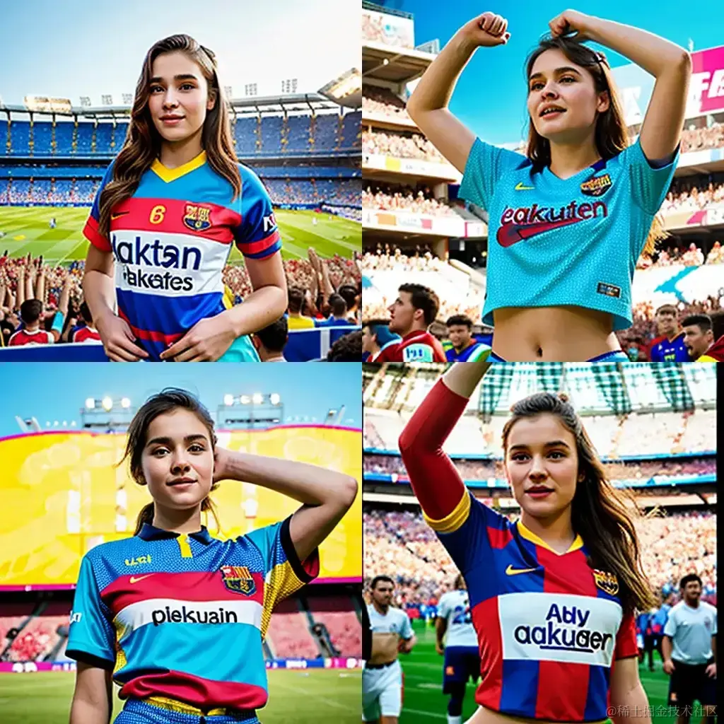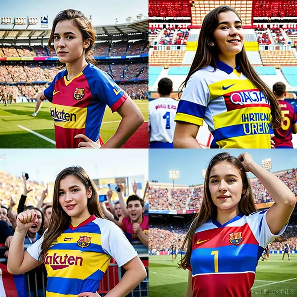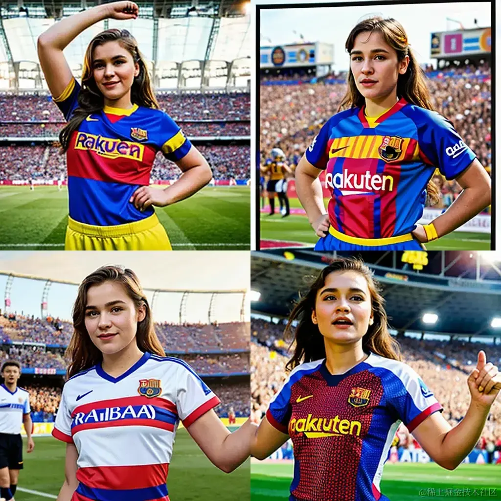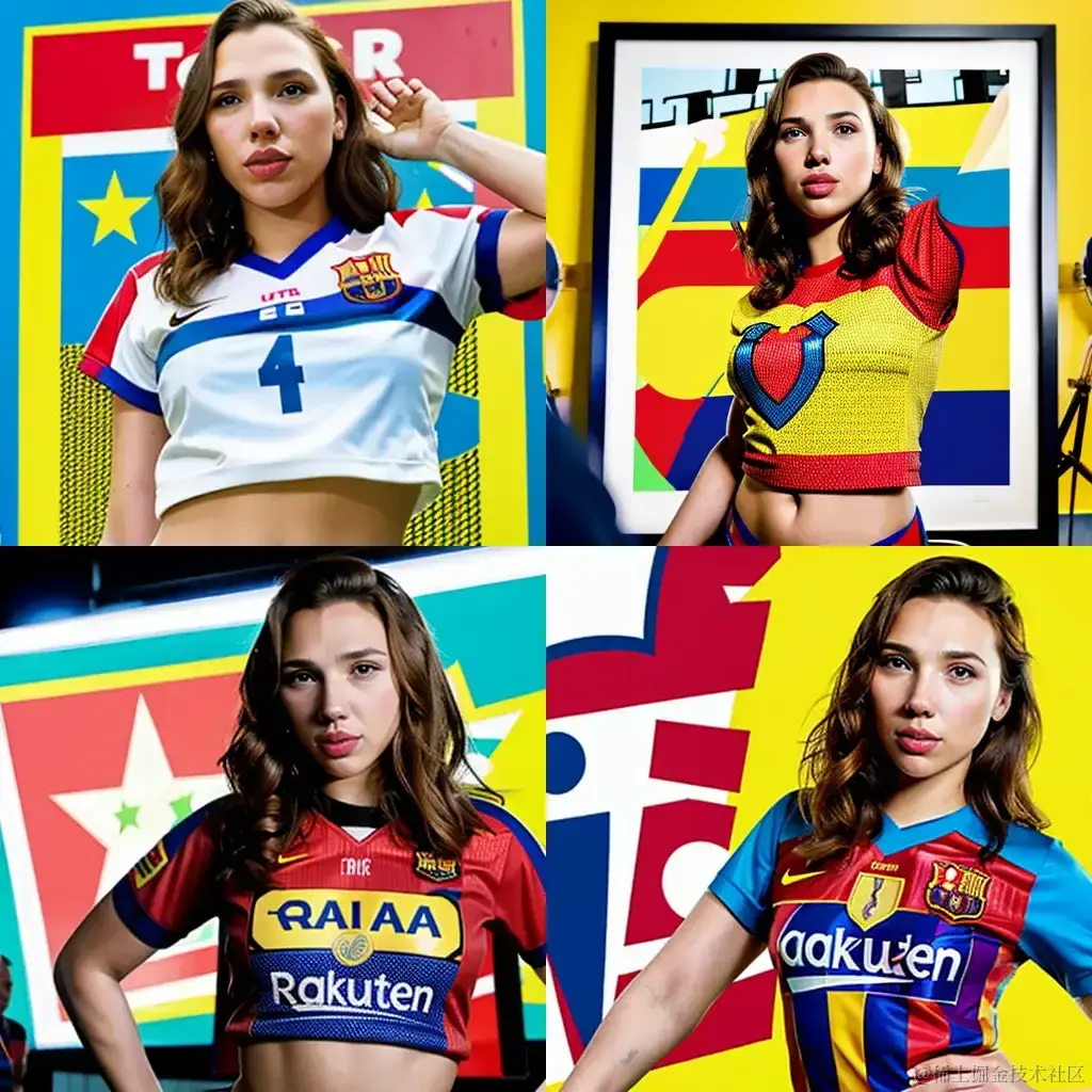 让我们在prompt中使用第二种格式: “一幅流行艺术风格、超写实主义的年轻女子肖像,(Gal Gadot: 0.9), (Scarlett Johansson: 1.1),身着巴塞罗那足球俱乐部球衣,在背景中与足球运动员及观众一起庆祝进球,由Stanley Artgerm Lau和Agnes Martin创作,来自Artstation,4K高清,焦点锐利,边缘照明,青色调。”