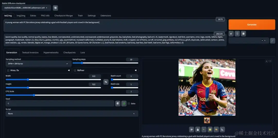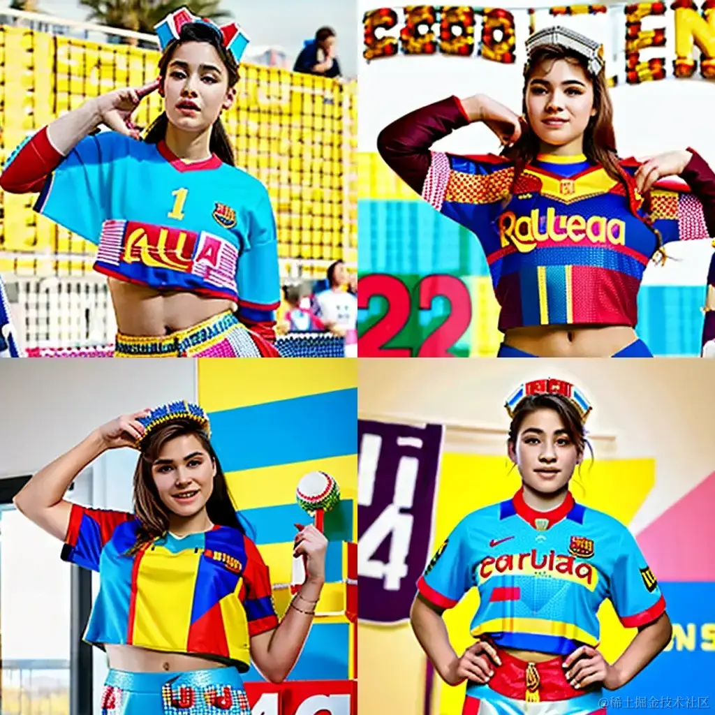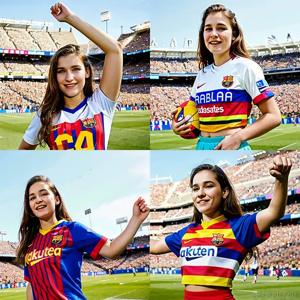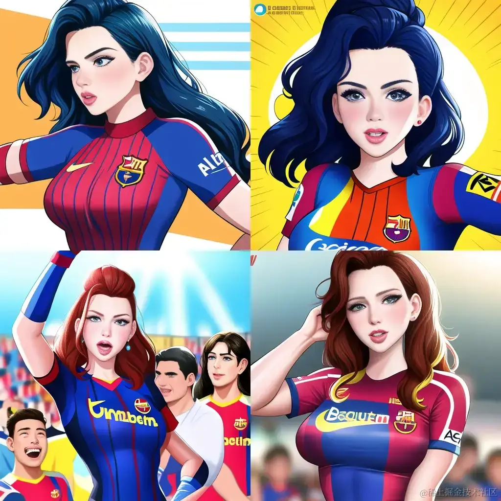 让我们在prompt中使用第二种格式: “一幅流行艺术风格、超写实主义的年轻女子肖像,(Gal Gadot: 0.9), (Scarlett Johansson: 1.1),身着巴塞罗那足球俱乐部球衣,在背景中与足球运动员及观众一起庆祝进球,由Stanley Artgerm Lau和Agnes Martin创作,来自Artstation,4K高清,焦点锐利,边缘照明,青色调。”
