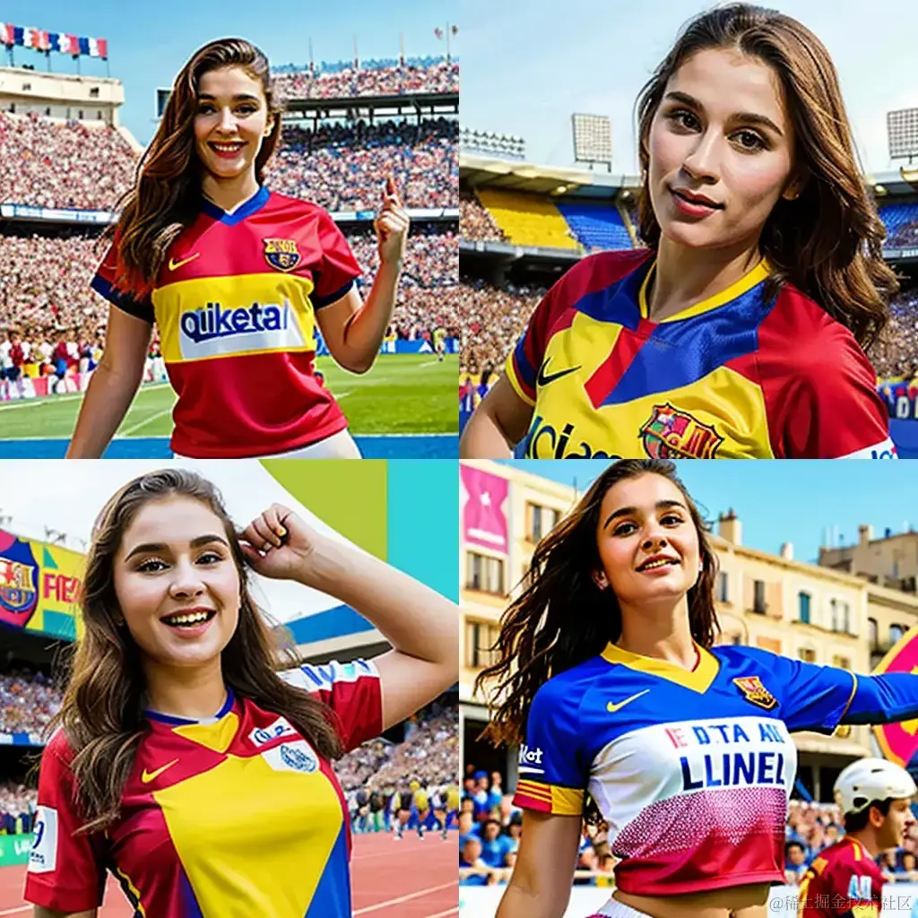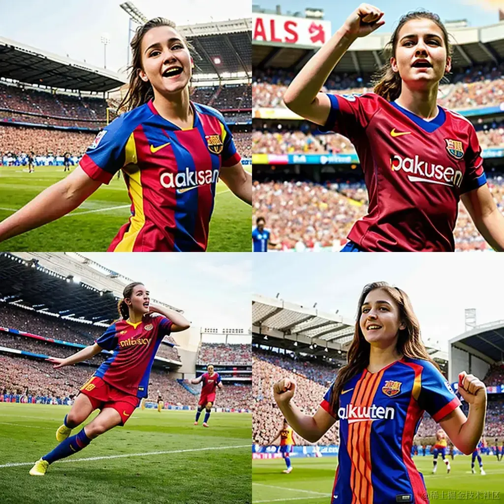 “一幅由Stanley Artgerm Lau和Agnes Martin创作、发布于Artstation、4K分辨率、焦点锐利、运用边缘光照的流行艺术超写实风格肖像,画面中一位身穿巴塞罗那足球俱乐部球衣的年轻女子正在与背景中的足球运动员及观众一同庆祝进球。”