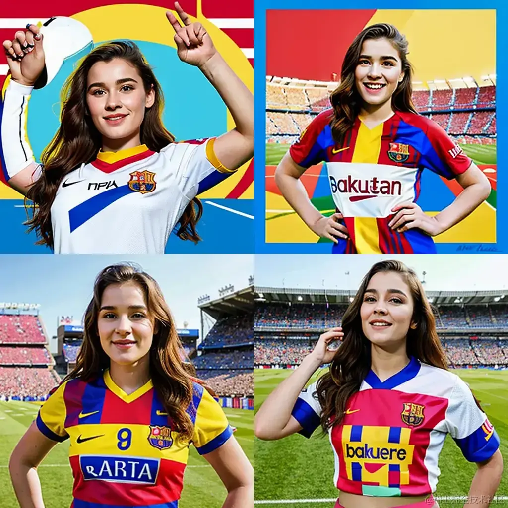 “一幅波普艺术风格的超写实肖像画,描绘了一位身穿巴塞罗那足球俱乐部球衣的年轻女子,与背景中的足球运动员和人群一起庆祝进球。”